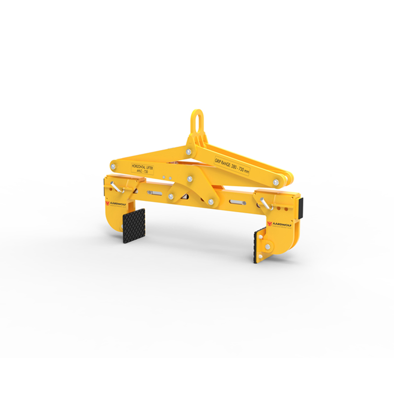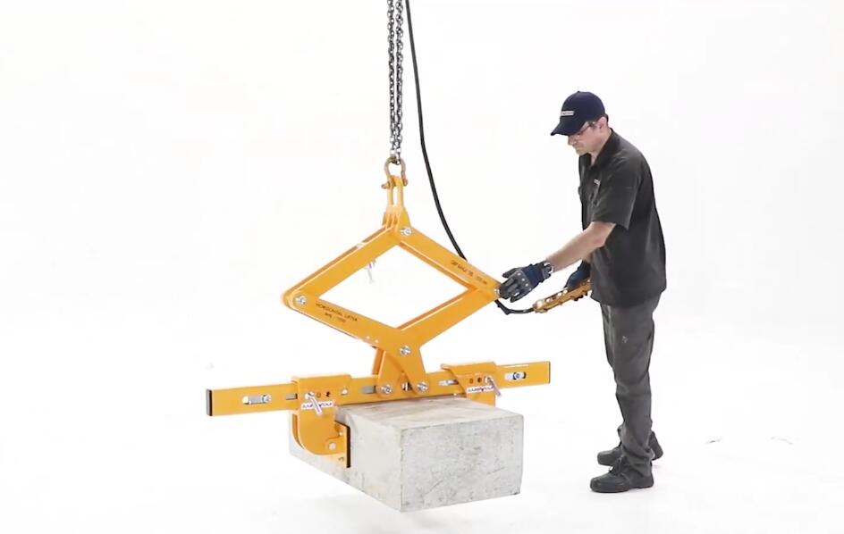 For lifting and moving of concrete blocks and natural stone. Suitable for use on cranes or forklift booms. Clamp jaws are gravity controlled.